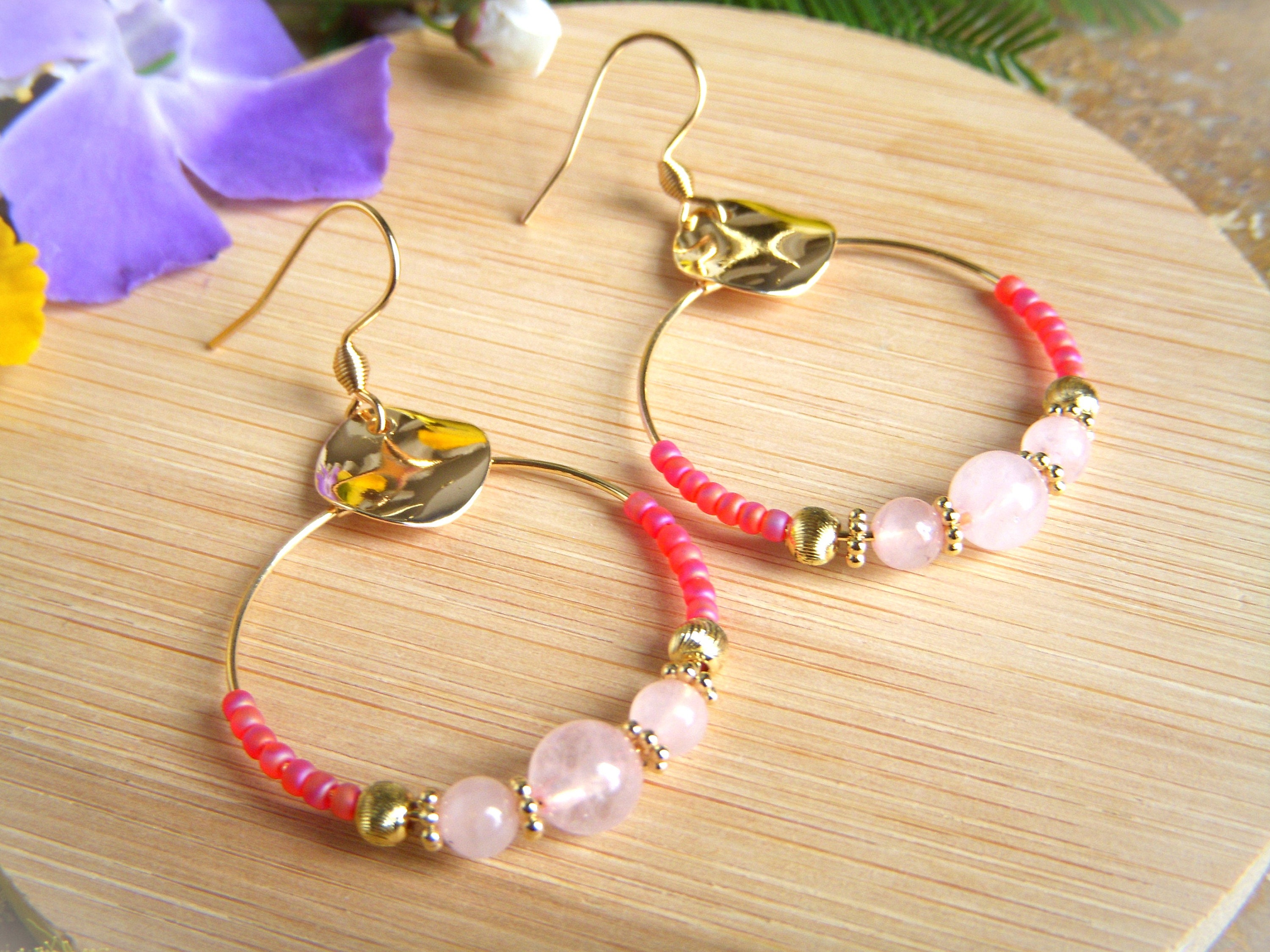 Pair of creole earrings in rose quartz beads and Indian pink glass beads with a small round pendant in 18k gold plate.