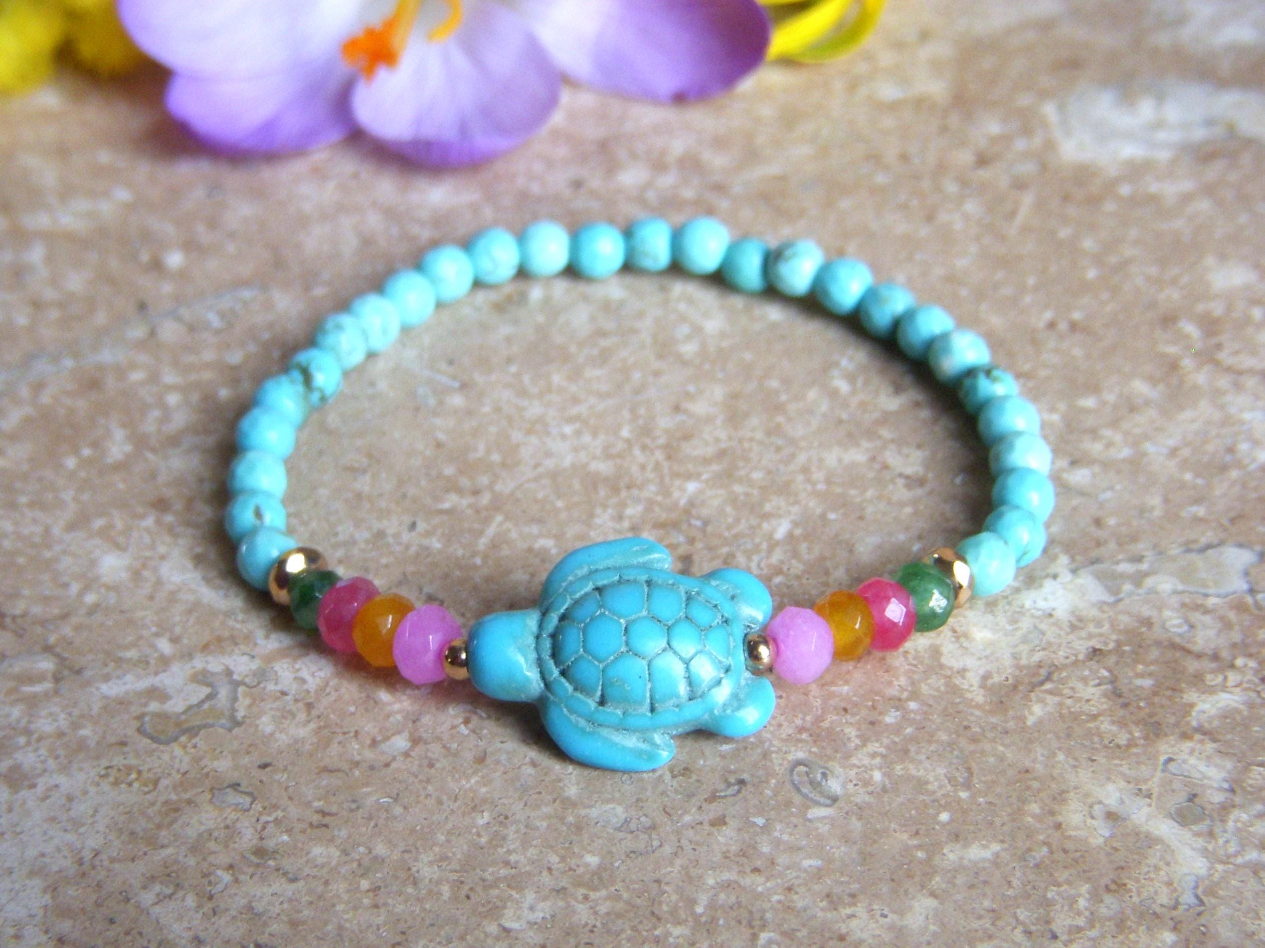 Children's Turtle Bracelet in Turquoise-tinted Howlite and Jade Beads, unisex children's bracelet. 2 colors to choose from: white is silver, multi-colored gold.