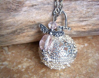Pregnancy bola delicately chiseled silver, pregnant woman gift, pink quartz pearl, pink flower pompom. Maternity gift.